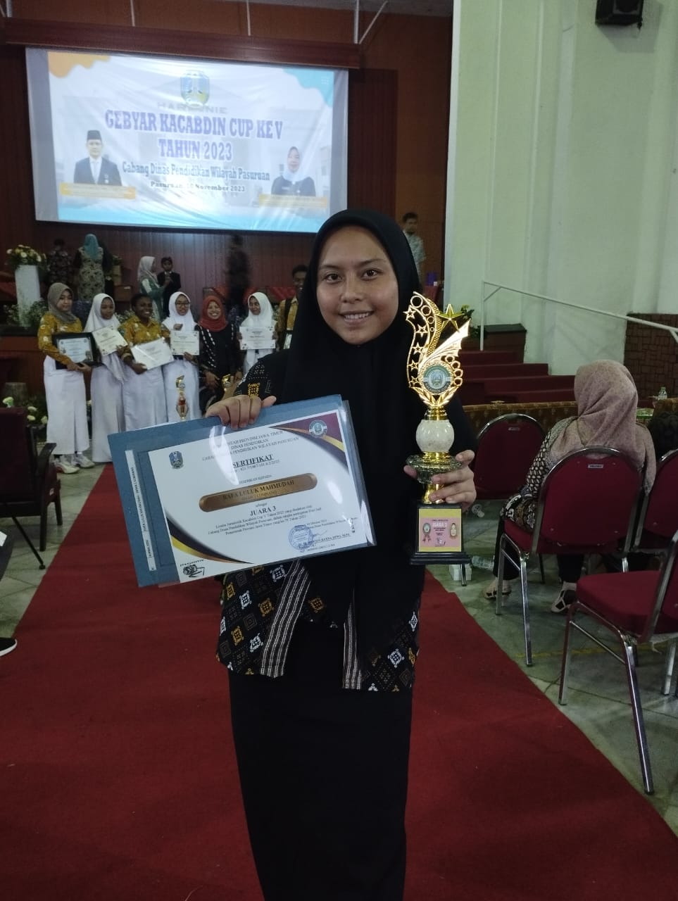 Pasuruan – Rafa Luluk Mahmuda, siswa SMAN 1 Lumbang meraih juara 3 dalam lomba jurnalistik Kacabdin Cup V 2023. Siswa yang tergabung dalam komunitas literasi tersebut telah berhasil meraih juara 3 dari 25 peserta yang mengikuti lomba. Pada Jumat lalu (10/11), seluruh pemenang lomba hadir dalam kegiatan Gebyar Kacapdin Cup V 2023 untuk mendapatkan apresiasi. Bertempat di gedung Harmonie SMKS Untung Suropati Kota Pasuruan, acara berlangsung meriah dan sukses.
